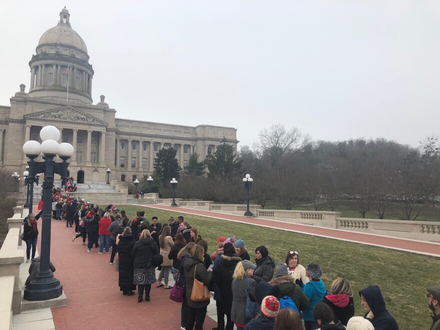 Lines to get into the building stretched all the way back to Capitol Avenue. Inside, hundreds huddled at the base of the Kentucky House steps with messages for lawmakers like "No 525!" and "This is our house!"